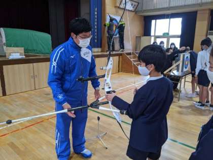 実際に弓を触らせていただいたり、銀メダルをかけさせていただいたりしました。