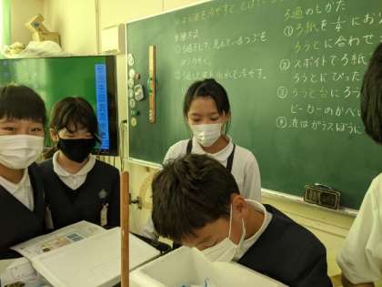 飽和状態の水溶液を冷やして、中の物質が結晶として表れるのを観察していました。