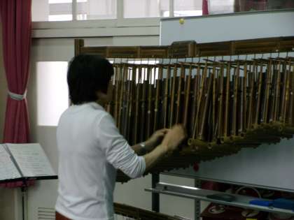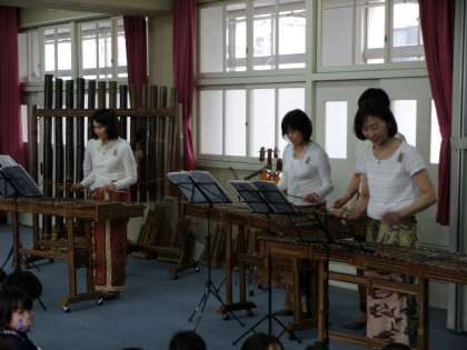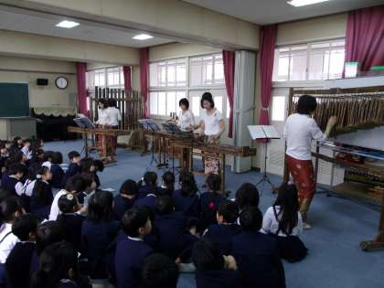 2月5日(木)1年生は、インドネシアの伝統楽器「アンクロン」(竹や木でできています)の演奏を聞き、実際にさわって音も出してみました。