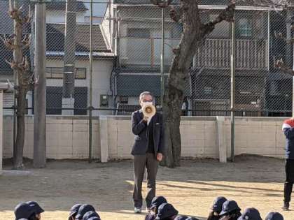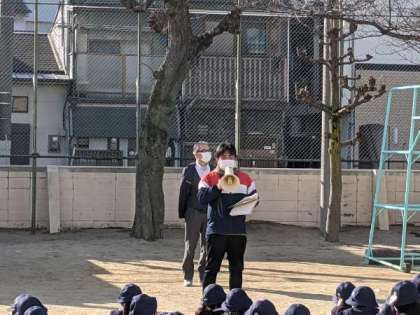 運動場に避難したあとは、担当者から気をつけてほしい点と学校長から東日本大震災のお話がありました。
