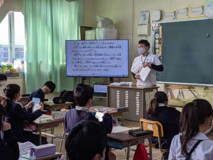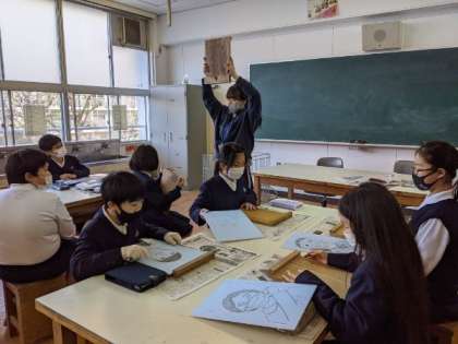 彫刻刀を使って版画をするために気をつけることの確認をしていました。
