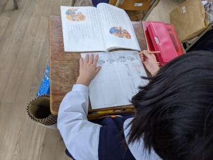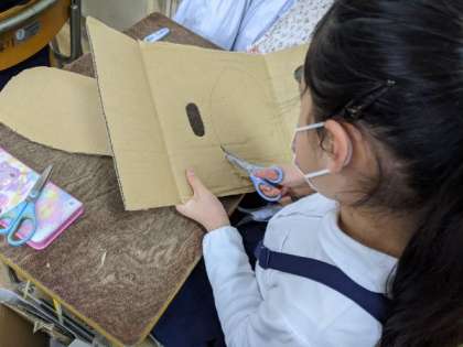ダンボールをはさみで切って、ふくろうを作るパーツを作っていました。