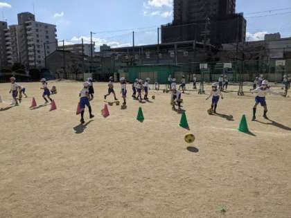 目標のものに向かってボールをける練習をしていました。