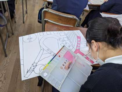 絵の具を使って丁寧に色をおいていました。