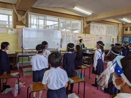 フェイスシールドをつけて、校歌の練習をしていました。
