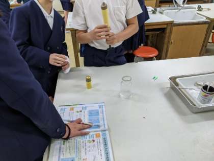 気体検知管を使って、ものを燃やした後のビンの中の空気を調べていました。