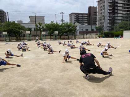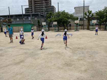 準備体操をして、速く走るためにいろいろなブースを作って、トレーニングをしていました。