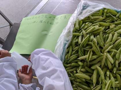 給食調理員さんが、調理を終えたえんどう豆の豆殻を見せてくださりました。