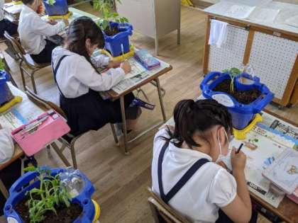 それぞれが選んだ野菜の苗を観察していました。