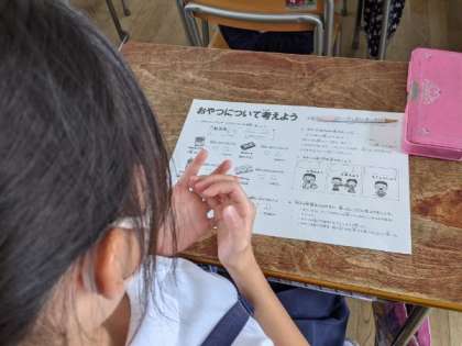栄養教諭の方にきていただき、「おやつ」について学習していました。