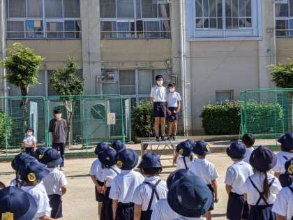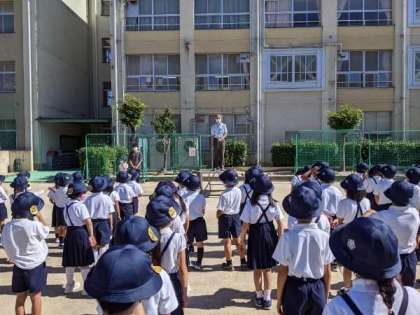 今年の長い長い梅雨が明け、よいお天気の元、今学期最後の児童朝会を行いました。