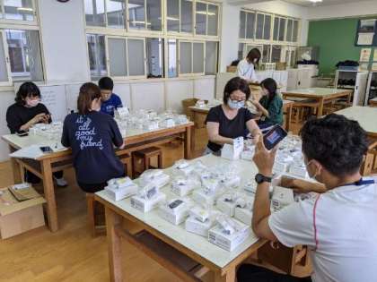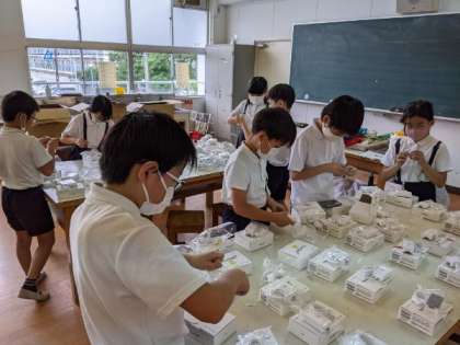 pocket Wi-Fiの学校管理用シールを貼る作業を児童が手伝ってくれました。