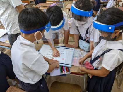 紙の鍵盤を使って、音を出さず、鍵盤ハーモニカの指の練習をしていました。