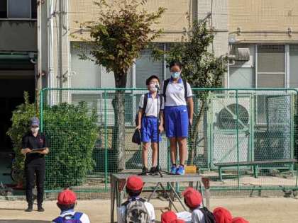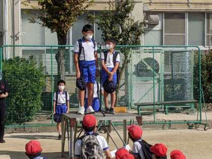 運営委員会の児童が全校遠足のルールや注意点を話していました。