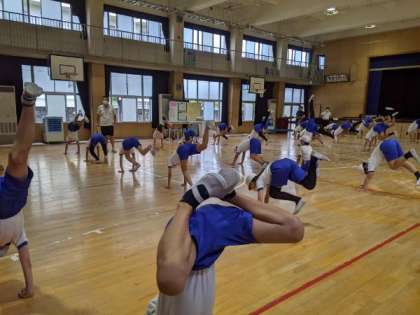 倒立ブリッジやロンダートに必要な体の感覚を養い、グループで協力して技の習得を目指しました。