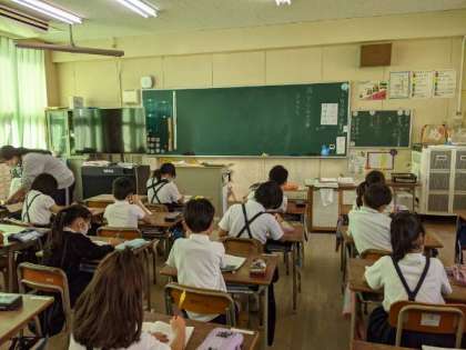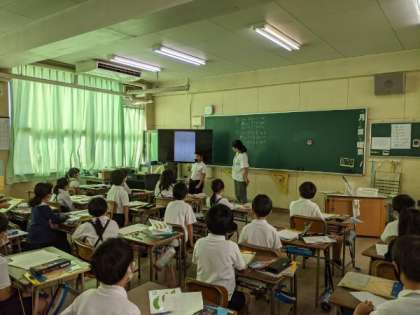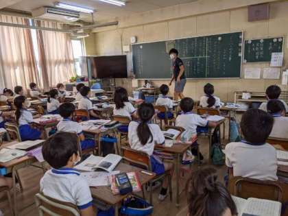 学校の中を探検して、かけ算のまとまりを見つけていました。教室に戻った後は、見つけたかけ算を発表していました。