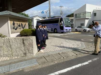 お世話になった「むさし」さんの看板の前でグループ写真です。とてもいいお宿でした。