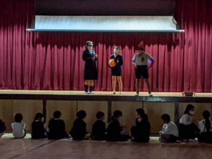 舞台の上では、キャンプファイヤー係が楽しいゲームを進行していました。