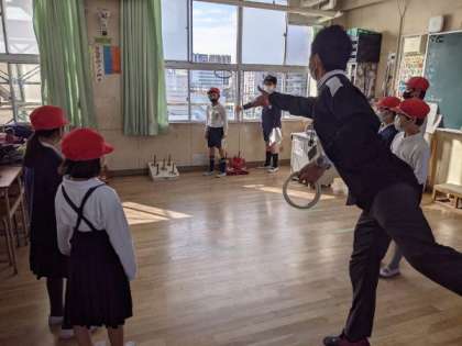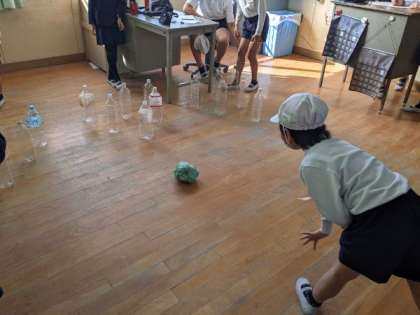 離れたところから、新聞紙を丸めたボールを投げてペットボトルを倒すゲームです。