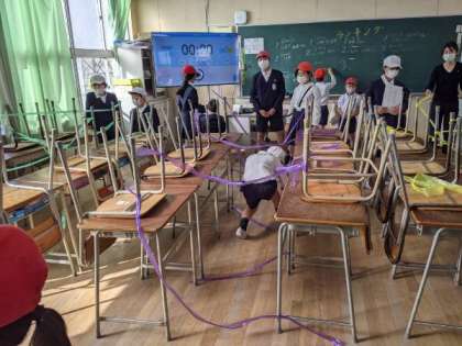 スズランテープに触れないように、できるだけ早く反対側へ抜けるゲームです!