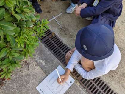 温度計を使って、地面の温度がどう違うのか調べていました。