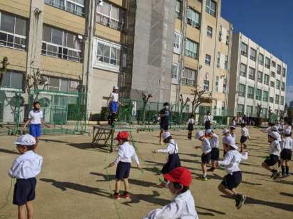 2時間目と3時間目の間の休み時間に1〜3年生でなわとびに取り組みました。