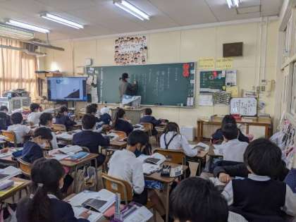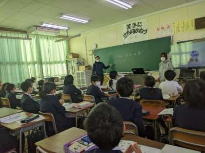 C-NETの先生と担任の先生のやり取りを聞いて、子どもたちも友だちと交流していました。