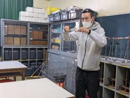 ふたつの長さの異なるふりこをつるした金属の棒を指導者が持っています。