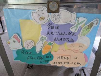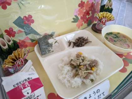 給食調理員さんが、見本をお正月らしく飾り付けてくれていました。※1枚目