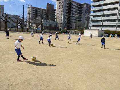 ボールをコントロールしたり、友だちにパスをしたりして、楽しんでいました。
