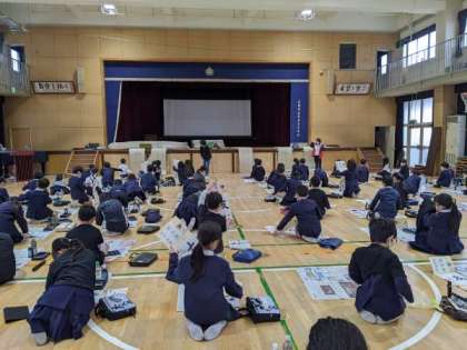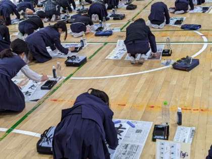 講堂で長めの半紙を使って、習字に取り組んでいました。