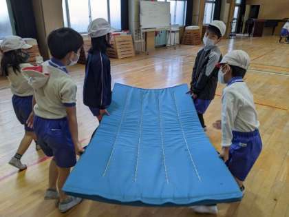 グループで協力してマットを運び、いろいろな転がり方を楽しんでいました。