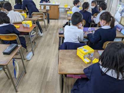 ロボットを使って、自分の指示したとおりに動かせるかどうか友だちと協力しながら、学習していました。