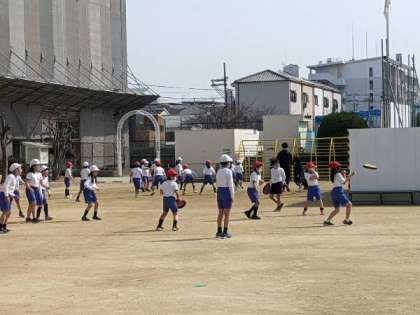 ドッジボールをフリスビーを使って行う活動を楽しんでいました。