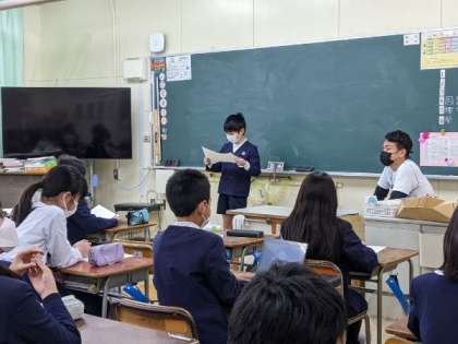 5年生に向けて考えたことをみんなの前で発表していました。