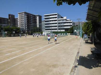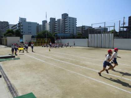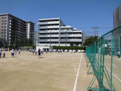 運動場では50m走とソフトボール投げ、講堂では立ち幅跳びと長座体前屈を実施しています。