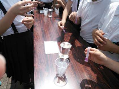水質調査は城北川「そのままの水」と「醤油3滴をたらした水」を比較します。