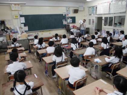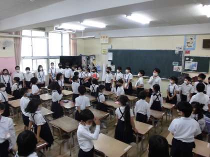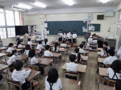 今日の朝は4年1組さんが1年1組さんにおすすめの本を紹介する活動をしていました。