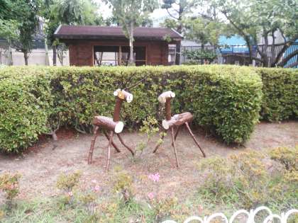 門を入ったところの植込みの奥に管理作業員さんが上手に木工の「鹿」を作ってくれました。