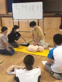 胸部圧迫とAEDの使い方を模型で確認しながらの研修です。事故が起こらないよう、また起こった時にも万全に対応できるよう心がけていきます。