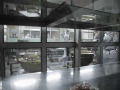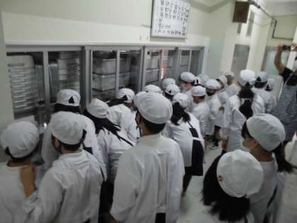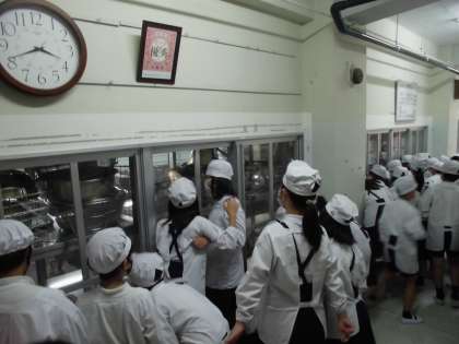今週は給食室の見学週間ということで、15分休憩を使って給食室の様子や、実際に給食を作っている様子を見学しています。
