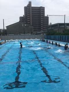 昨日、プール掃除をして水換えしたばかりの水泳の授業です。きれいで冷たい水で、楽しく、気もちよく泳ぐ高学年の子どもたちです。