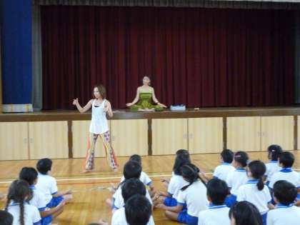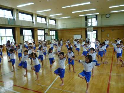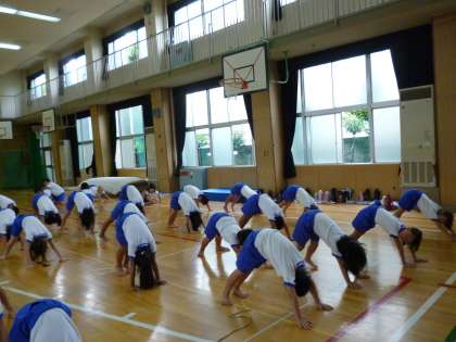 「インドヨガ」の先生に来ていただき一緒に活動しました。2年生は1学期から、学習園で「綿づくり」を行っています。さまざまな国や地域の綿を育てています。そのうちの1つがインドの綿です。そのためにインドの文化に触れる取り組みとして、行いました。うまくできたかな?