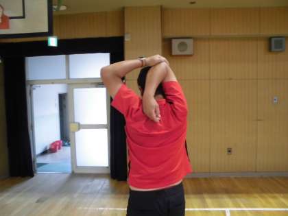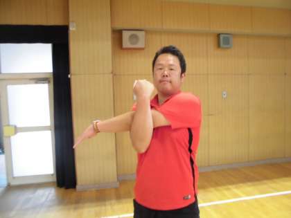 今日は肩をしましょう。これは結構おなじみのストレッチかな。