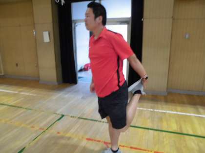 立った状態で片方の足を曲げ、その足先を手で背中につけるようにしましょう。