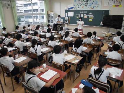 今日は4年生で歯科衛生士さんにお越しいただき、フッ化物洗口・歯磨きに関しての授業を行いました。