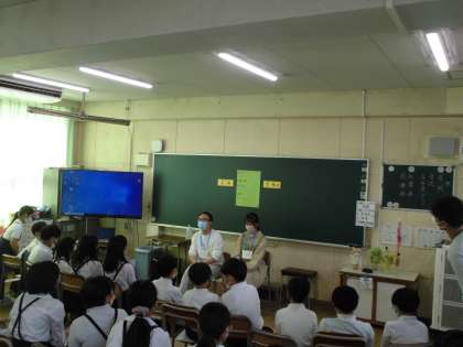 5年生は運動会で発表した団体演技をした後、各クラス教室にわかれて留学生の母国の紹介・質疑応答・事前に調べた日本の文化紹介をしました。