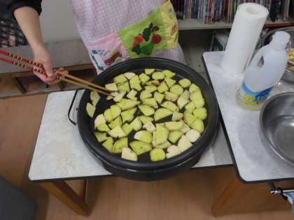 各クラスでホットプレートにたくさんのさつまいもを敷き詰めて、焼いていきます。