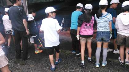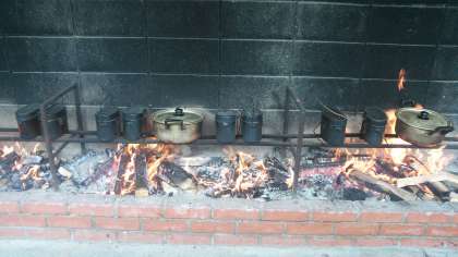 カレーの野菜を切って、煮込んでいます。ご飯も飯盒に入れて炊いています。