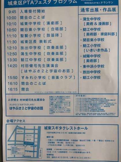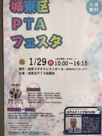 今週の29日「日曜日」に城東スギタクレストホールにて【城東区PTAフェスタ】が開催されます。合唱部の発表や絵画作品の展示など盛りだくさんです。